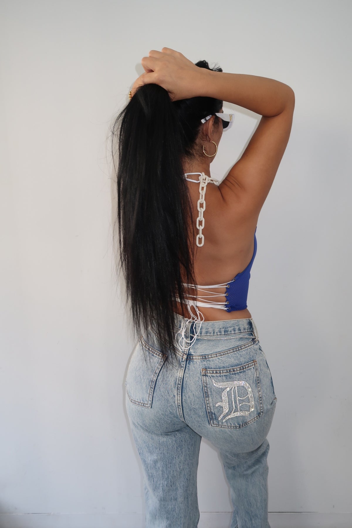 Turn heads in this blue jersey-inspired crop top for women, designed with bold varsity numbers on the front and trendy white chain halter straps. The open lace-up back gives it a sporty yet chic vibe, perfect for pairing with jeans, cargos, or shorts. Whether it’s game day, festivals, or a night out, this chain strap crop top will keep you looking stylish and confident.